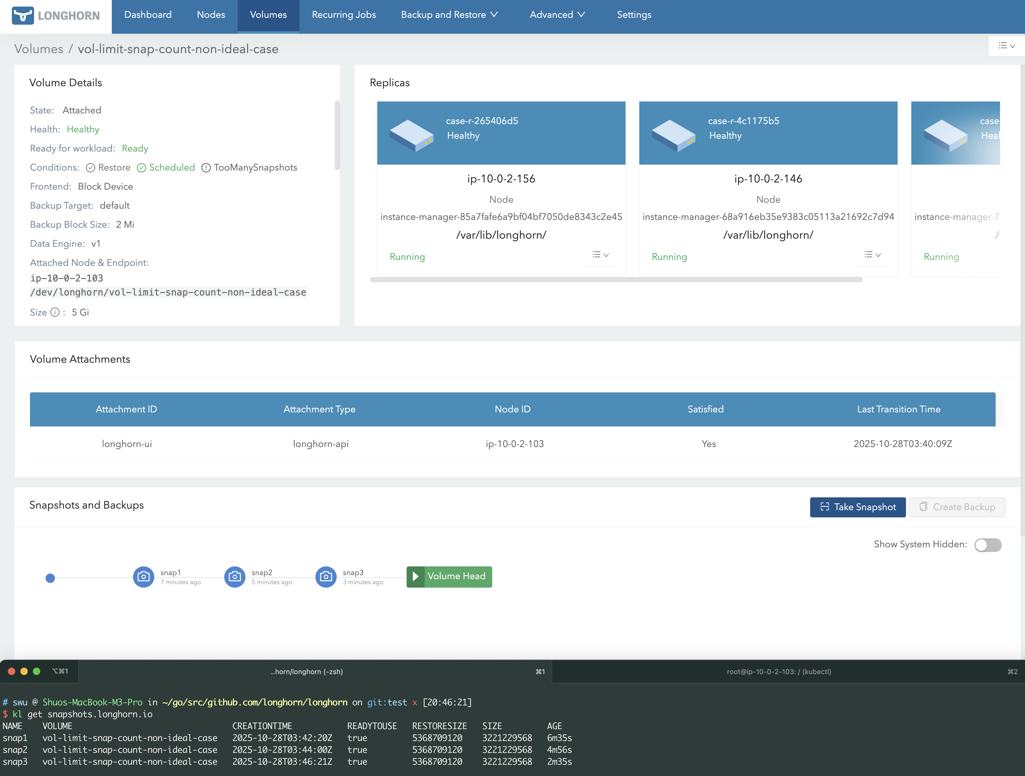Therefore, after setting Snapshot Max Count or Snapshot Max Size, the maximum possible space usage of a volume replica becomes predictable — in other words, we are limiting the replica’s maximum space consumption.