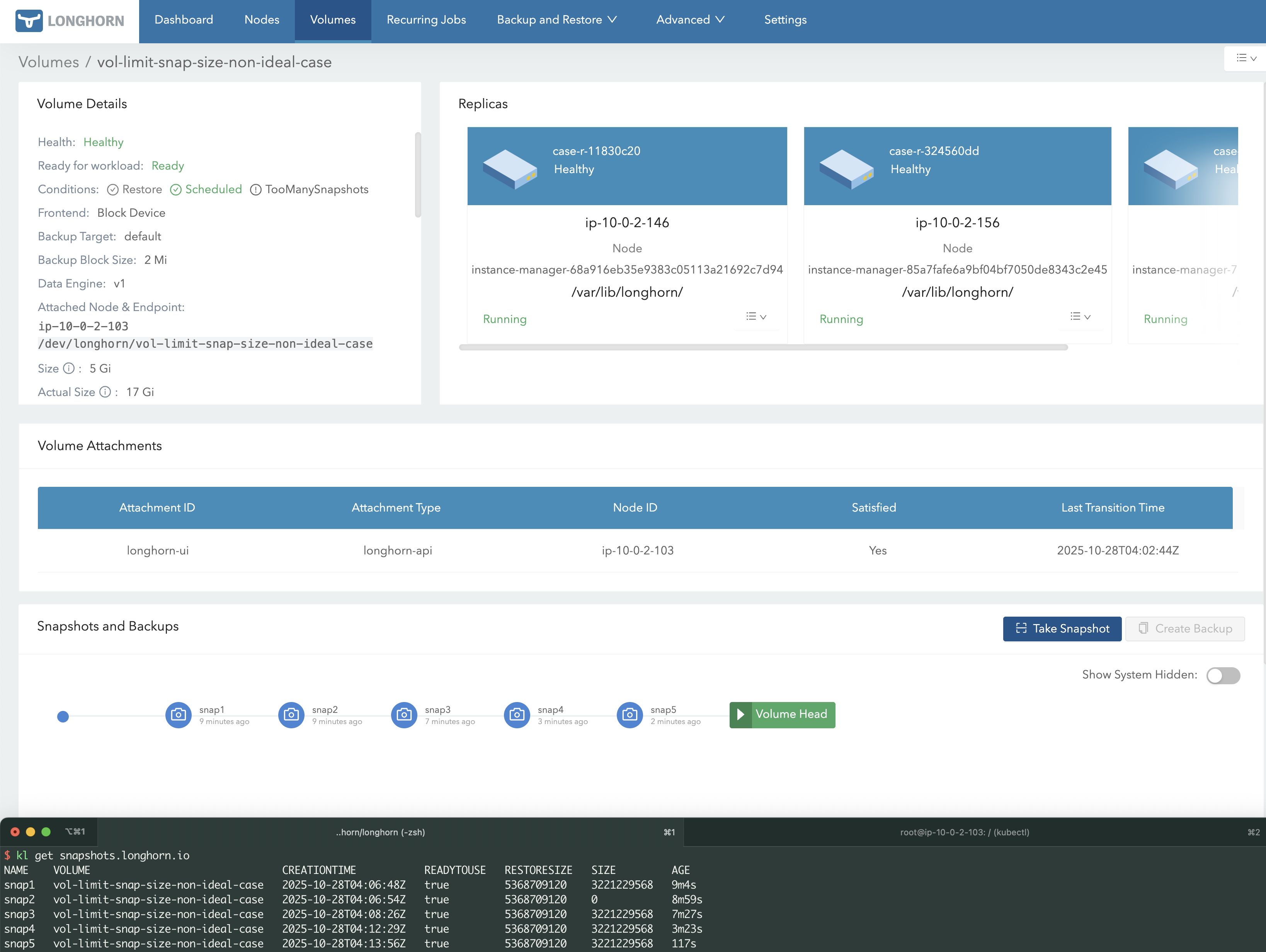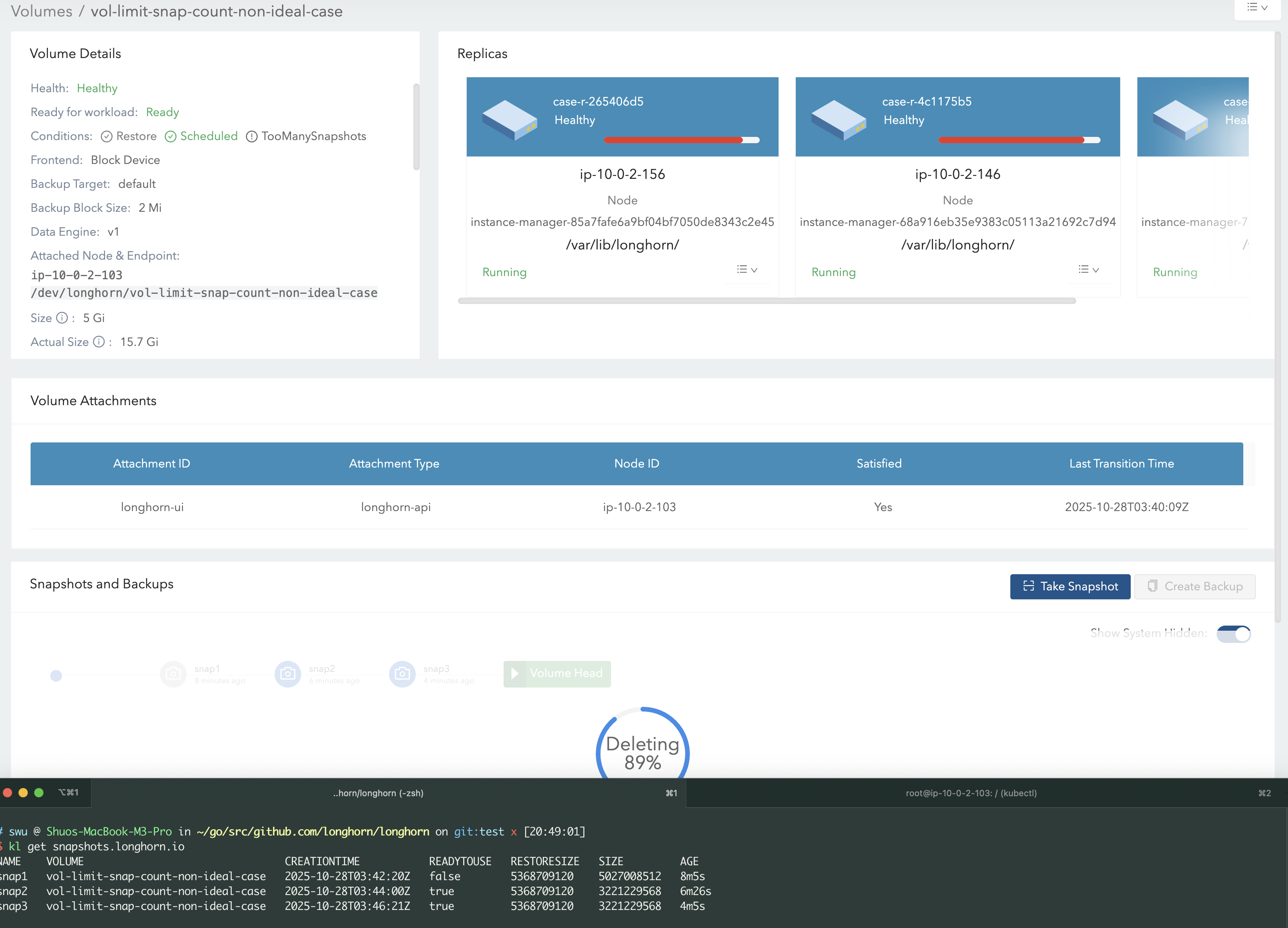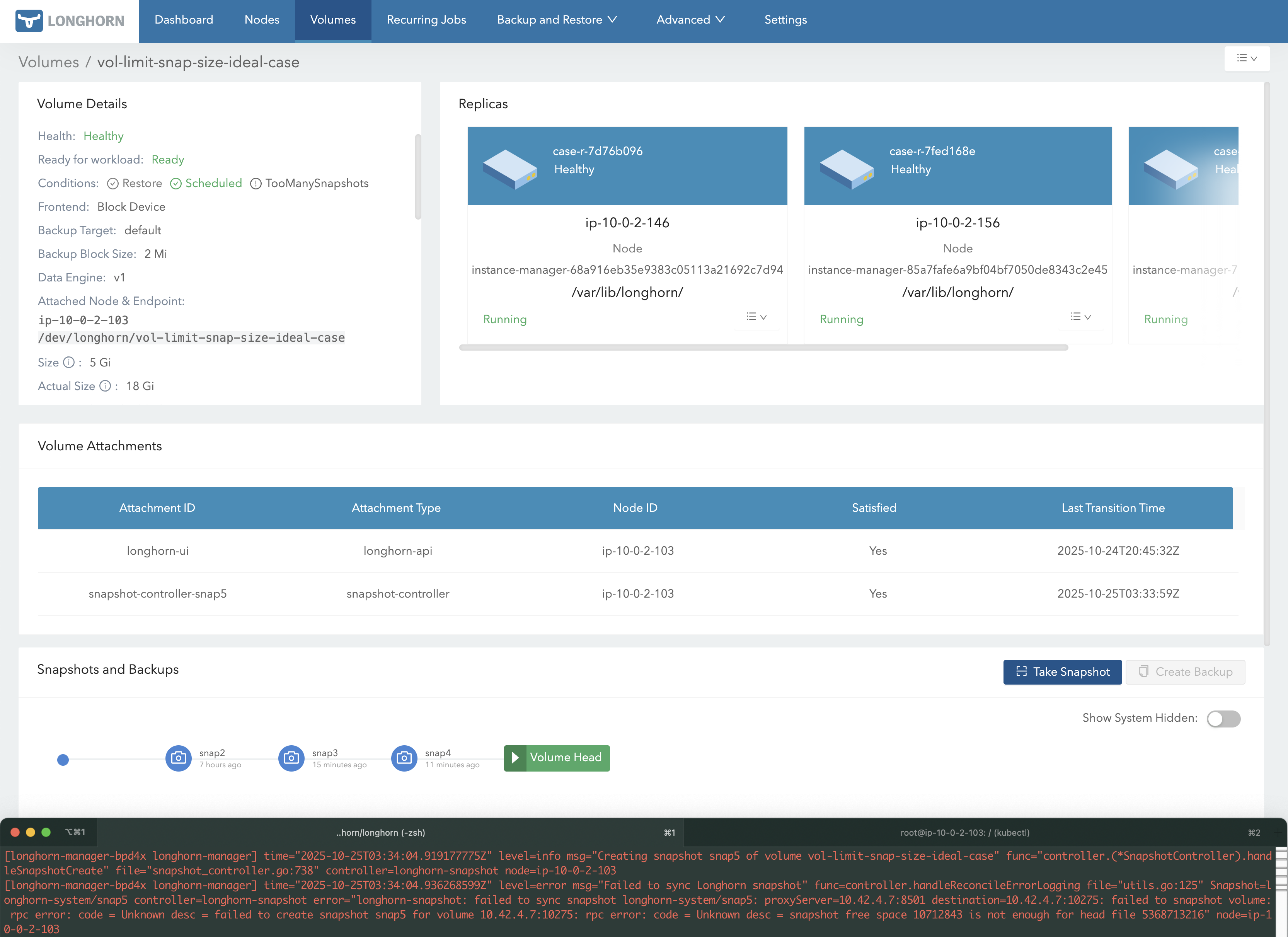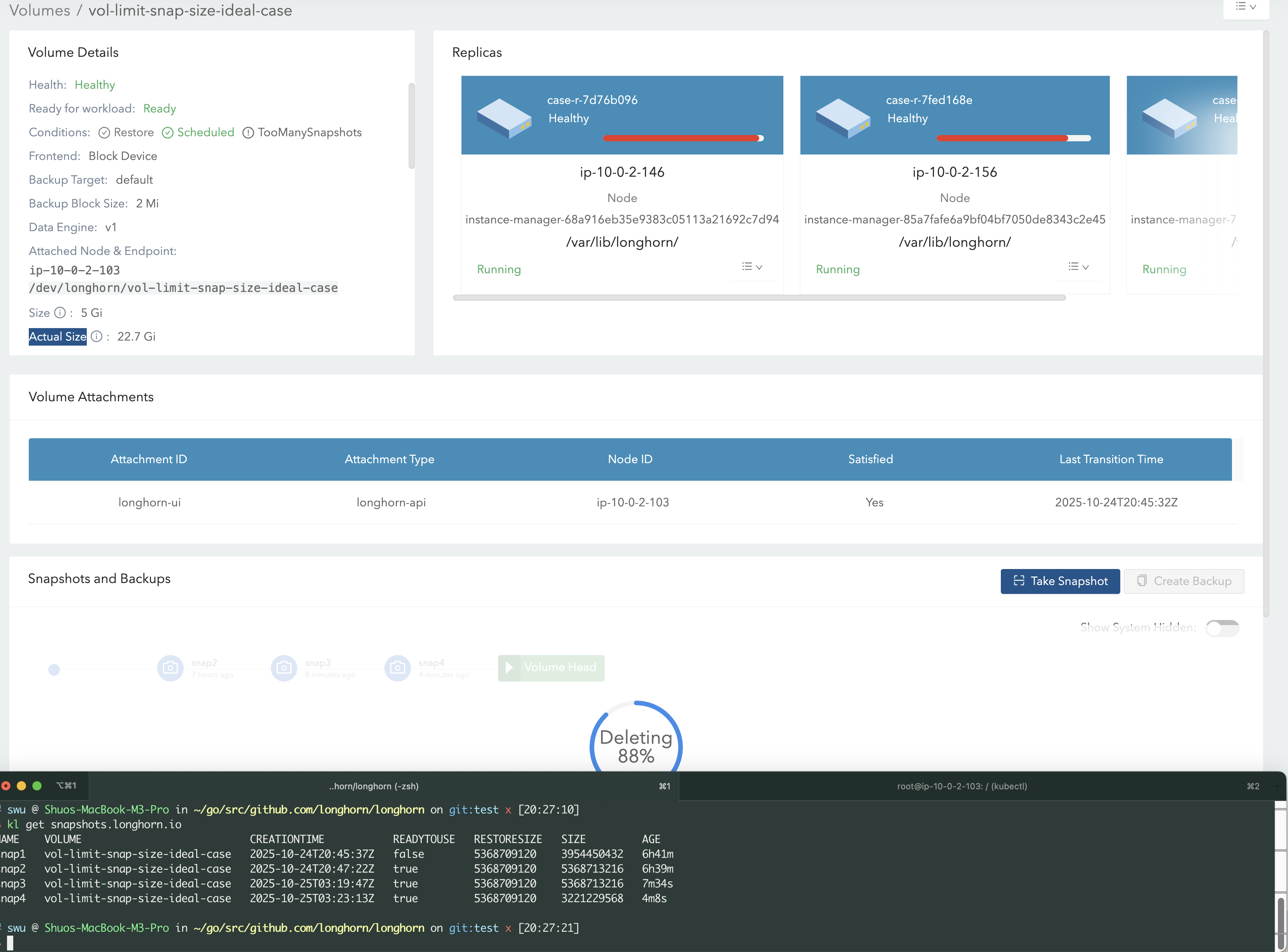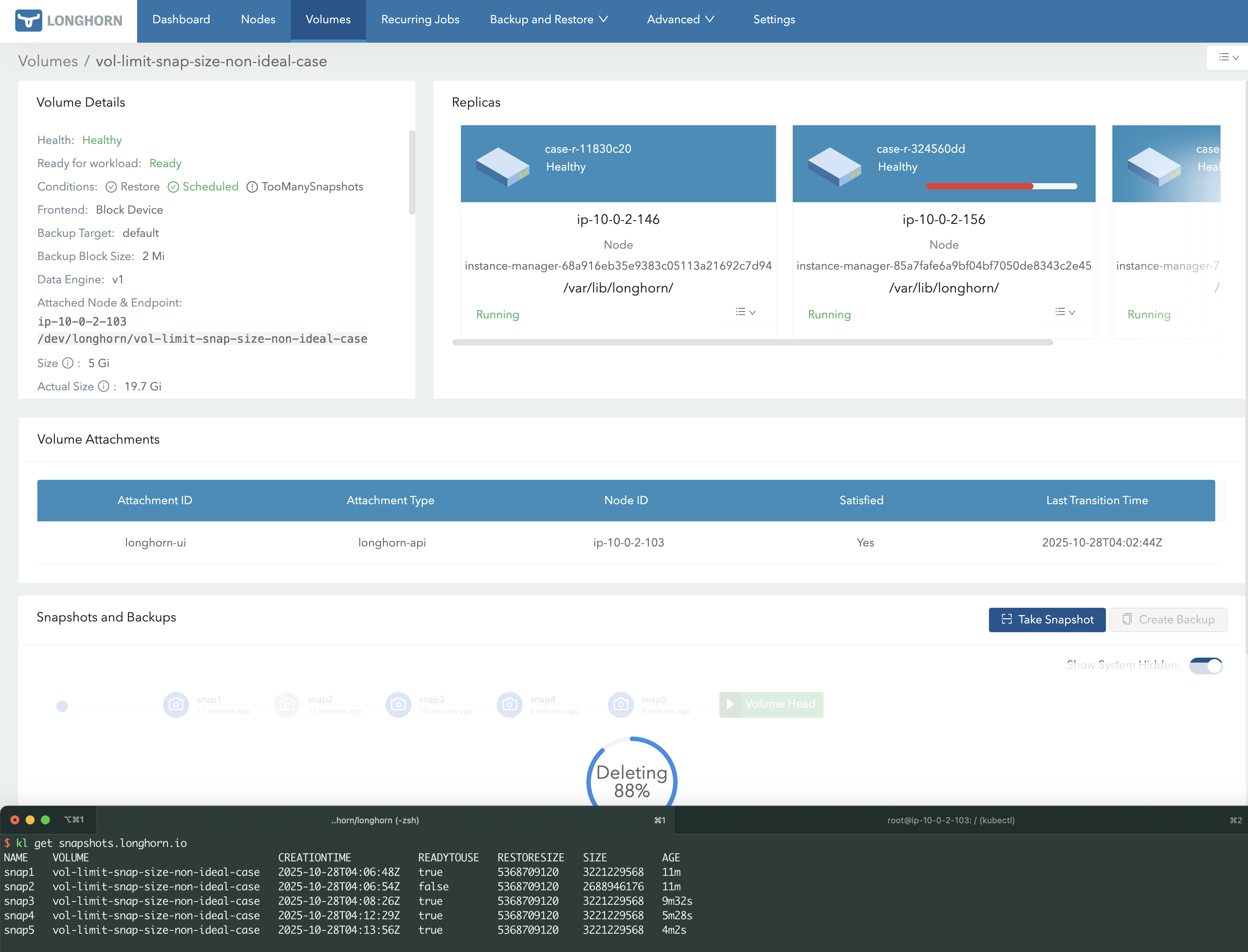 snap1 and triggering a purge, an extra 5 GB is temporarily used to merge snap1 and snap2, since Longhorn copies snap2’s data into the deleting snap1. This is why snap1 shows ~5 GB instead of 0 GB in the screenshot.13 GB + 5 GB + 5 GB = 23 GB.