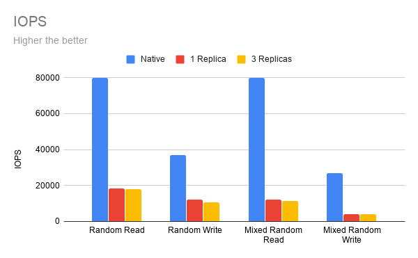 As you can see in the IOPS diagram above, Longhorn provides 20% to 30% IOPS of the native disk.