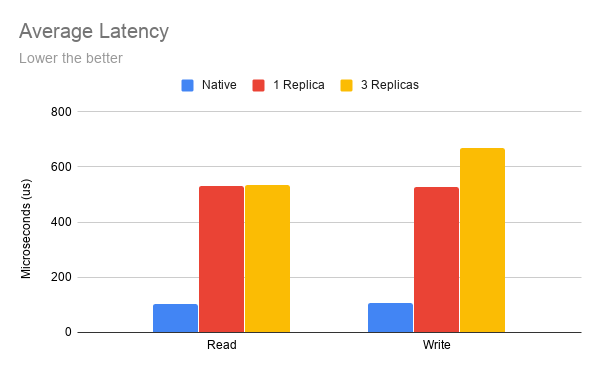 As you can see from the latency diagram, the native disk’s IO latency is about 100 microseconds per IO operation in our benchmark. Longhorn adds another 400 microseconds to 500 microseconds on top of it, depending on how many replicas are used and if the operation is read or write.